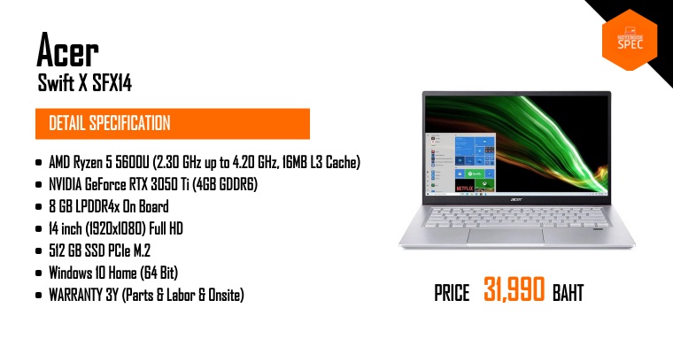 รีวิว Acer Swift X สเปก Ryzen 5 + RTX 3050 จอ 14″ สาย Creator มี Office แท้ ประกัน 3 ปี On-SiteSep 17, 2021 -
