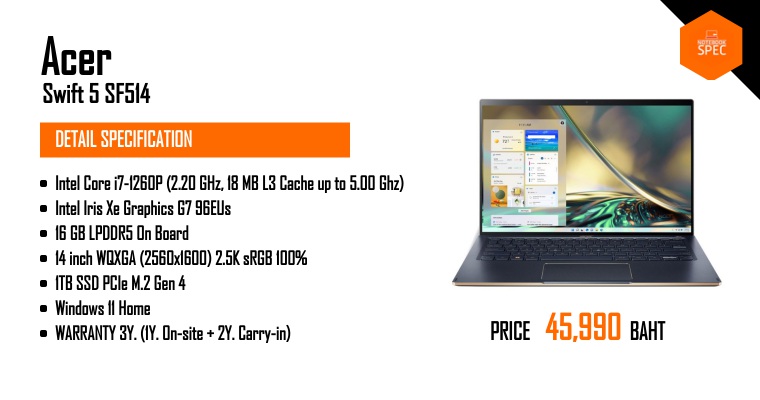 รีวิว Acer Swift 5 ยกเครื่องใหม่ เบา 1.2Kg ยัดสเปคแรง DDR5 จอ 2.5KAug 6, 2022 -