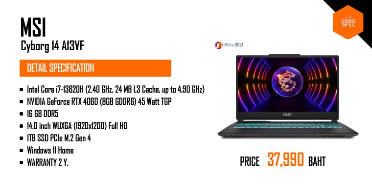 MSI Cyborg 14 A13VF เกมมิ่งโน๊ตบุ๊คตัวเล็กราคาเบา 37,990 สเปคแรงคุ้ม เล่นเกมแรงจะเลิศแค่ไหน!?Sep 4, 2024 -