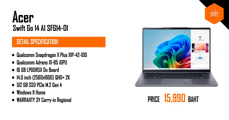 Acer Swift Go 14 AI โน้ตบุ๊คพลัง Snadragon X Plus มี AI ช่วยทำงาน ในราคาเบาๆ #Acer #Snadragon #nbsNov 30, 2024