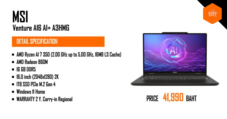 รีวิว MSI Venture A16 AI+ A3HM พลัง Ryzen AI 7 ทำงานไหลลื่น ฟีเจอร์แน่นไม่แพ้รุ่นพรีเมี่ยม ได้สแกนหน้า จอ 2K OLED และ USB-C Full Function ในงบ 39,990 บาทAug 22, 2025 -