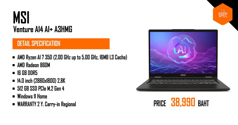 รีวิว MSI Venture A16 AI+ A3HM พลัง Ryzen AI 7 ทำงานไหลลื่น ฟีเจอร์แน่นไม่แพ้รุ่นพรีเมี่ยม ได้สแกนหน้า จอ 2K OLED และ USB-C Full Function ในงบ 39,990 บาทAug 22, 2025 -