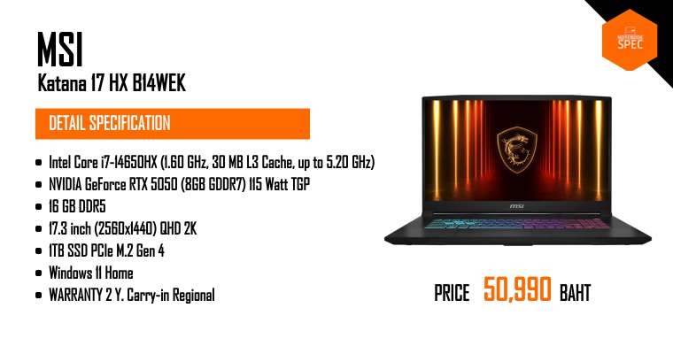 รีวิว MSI Katana 17 HX B14W ทรงพลังด้วย Intel Core i9 Gen 14+RTX 5060 จอเทพ 100% DCI-P3 พร้อมเล่นทุกเกม รับได้ทุกงานหนักชิลๆ ค่าตัว 55,990 บาท!Sep 13, 2025 -