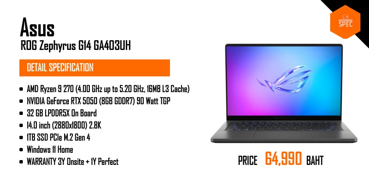 โน้ตบุ๊คเกมมิ่ง เล็ก แรง พลัง RTX 5050 | ASUS ROG Zephyrus G14 (GA403UH)Jul 20, 2025 -