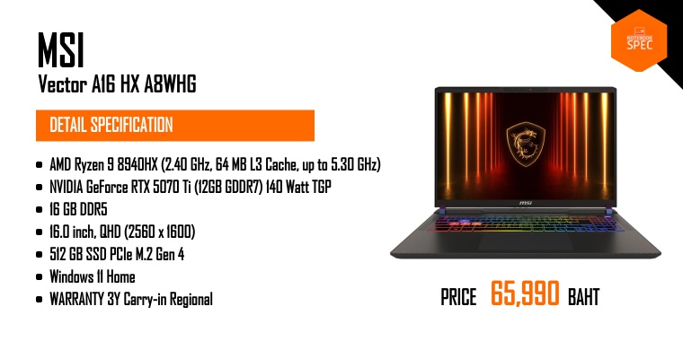 รีวิว MSI Vector A16 HX A8W จับคู่ของแรง Ryzen 9+RTX 5070 Ti เกิดมาลุยงานหนัก เล่นเกมไหนก็ไหลลื่น ฟีเจอร์แน่นไม่แพ้เรือธงในงบ 65,990 บาทเท่านั้น!Nov 10, 2025 -
