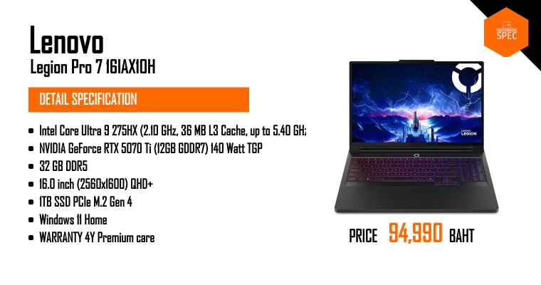 รีวิว Lenovo Legion Pro 7 16IAX10H สเปคแรง จับคู่ Intel Core Ultra 9 กับ RTX 50 Series เล่นเกม 4K ลื่น ทำงานหนักก็ไหว จอ OLED สวยสดเต็มตา ลูกเล่นมีมาเพียบ!!Dec 12, 2025 -