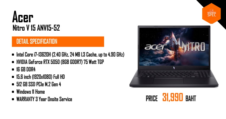 รีวิว Acer Nitro V 15 ANV15 จ่าย 29,990.- ได้ RTX 50 Series คู่ Intel 13th Generation ทำงานหนักก็สบาย เล่นเกมปรับสุดก็ไหว! สายคุ้มต้องโดน!Dec 31, 2025 -