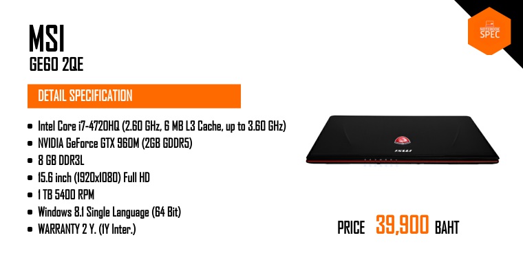 MSI GE60 ตัวท็อป ใช้ Core i7,แรม 8GB และการ์ดจอ GTX860M ลด 6,000 บาทเหลือ 40,900 บาทJan 20, 2015 -