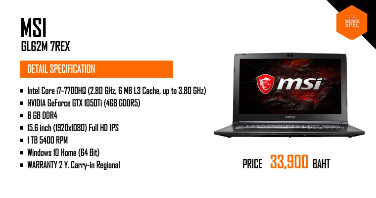 โน๊ตบุ๊คเล่นเกมลดราคา – MSI GL62M 7REX-2007XTH สเปก i7 + GTX 1050Ti เหลือเพียง 28,990 บาท ของแถมกว่า 2,000 บาทJan 19, 2018