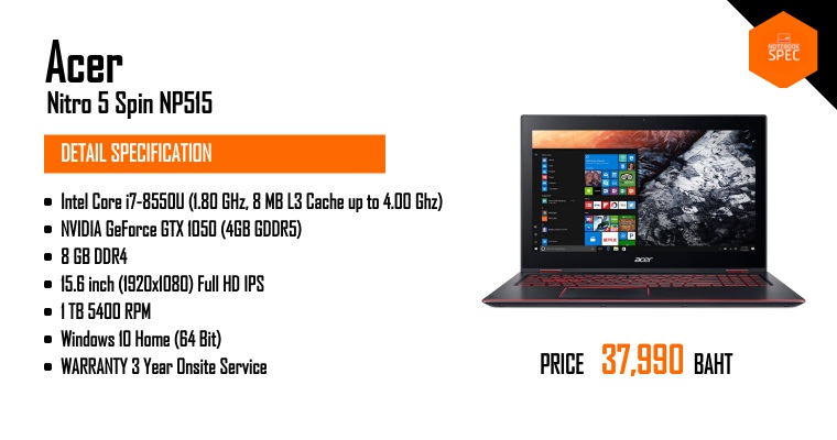 Acer - ขายแล้ว Nitro 5 Spin Gaming Notebook จอ 15.6" Full HD พับได้ 360 องศา สเปก i7 Gen 8 + GTX 1050Dec 22, 2017 -