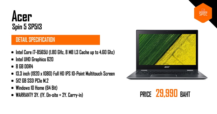 Review – Acer Spin 3 โน้ตบุ๊ค 2-in-1 จอสัมผัส 14 นิ้ว พร้อม SSD 256 GB + Win 10 แท้ ราคา 19,990 บาทMay 13, 2018 -