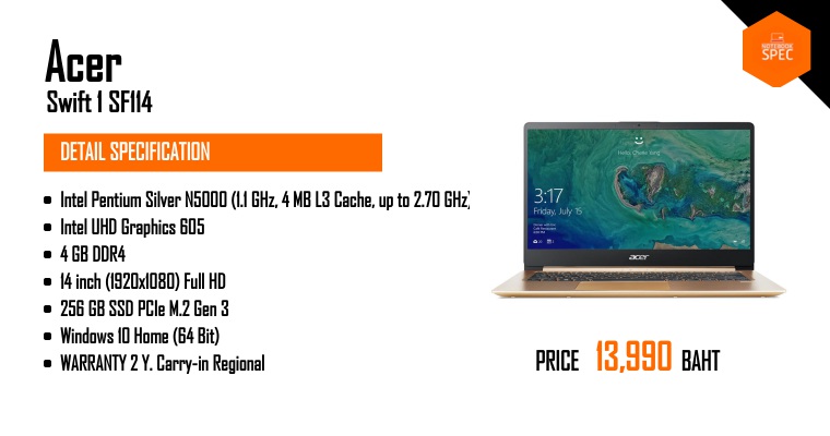 Acer - เปิดตัว Swift 1 รุ่นใหม่ มาพร้อมกับชิปประมวลผล Pentium N3710 สถาปัตยกรรม 'Gemini Lake'Apr 10, 2018